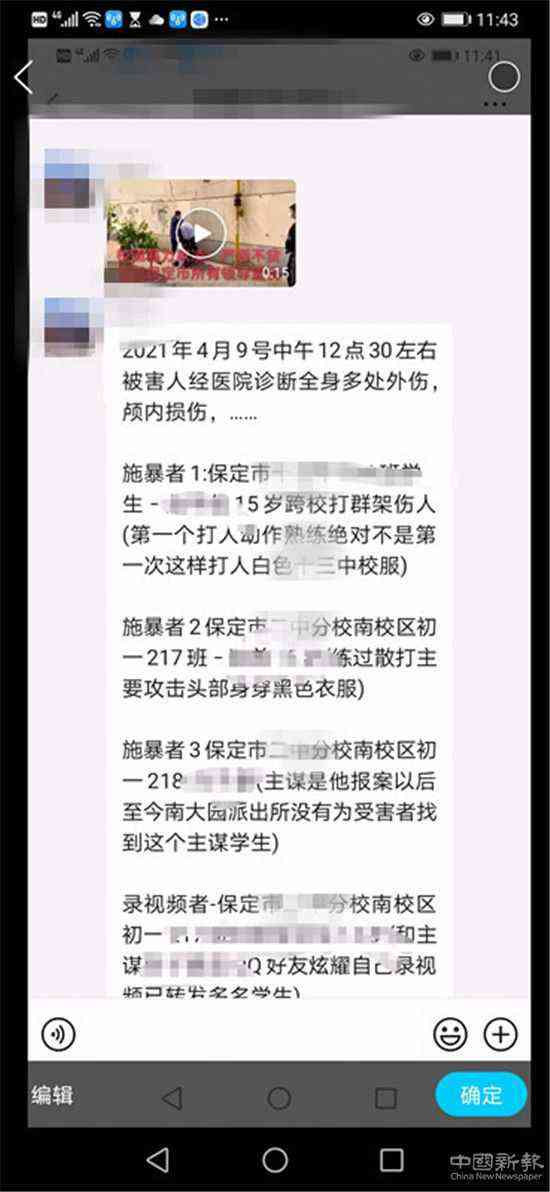 記者注意到,視頻下邊的文字(截圖)記錄了詳細(xì)的毆打時間為2021年4月9日和打人者分別為保定市蓮池區(qū)所屬兩個中學(xué)四個學(xué)生所為。但沒有注明毆打的起因和發(fā)生地點(diǎn)。