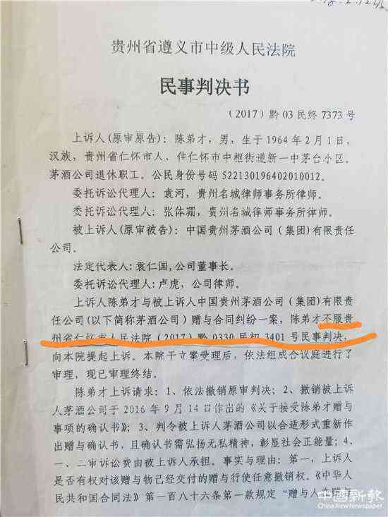 在一份蓋有貴州省遵義市中級人民法院印章的民事判決書中,記者見到該判決書第一頁第一段上訴人陳弟才與被上訴人中國貴州茅酒公司(集團(tuán))有限責(zé)任公司贈與合同糾紛一案中,本應(yīng)為陳弟才不服貴州省習(xí)水縣人民法院(2017)黔0330民初3401號民事判決被寫成仁懷市人民法院。