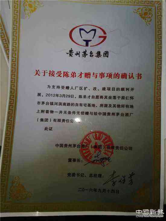 2016年9月14日,茅臺酒廠(集團(tuán))終于作出《接受陳第才的贈與事項確認(rèn)書》,該內(nèi)容為支持受贈人廠區(qū)擴(kuò)、改、建項目的順利開展,2012年3月29日陳弟才自愿將其坐落于原仁懷市茅臺鎮(zhèn)河濱南路的自有宅基地、房屋及其他所有地上附著物一并無條件無償贈與給中國貴州茅臺酒廠(集團(tuán))有限責(zé)任公司,給當(dāng)?shù)匕徇w戶起到了表率。然而確認(rèn)書中卻將房屋、土地面積遺漏,并將無償贈與添加為無條件贈與。完全曲解了他無償贈與的前提條件,