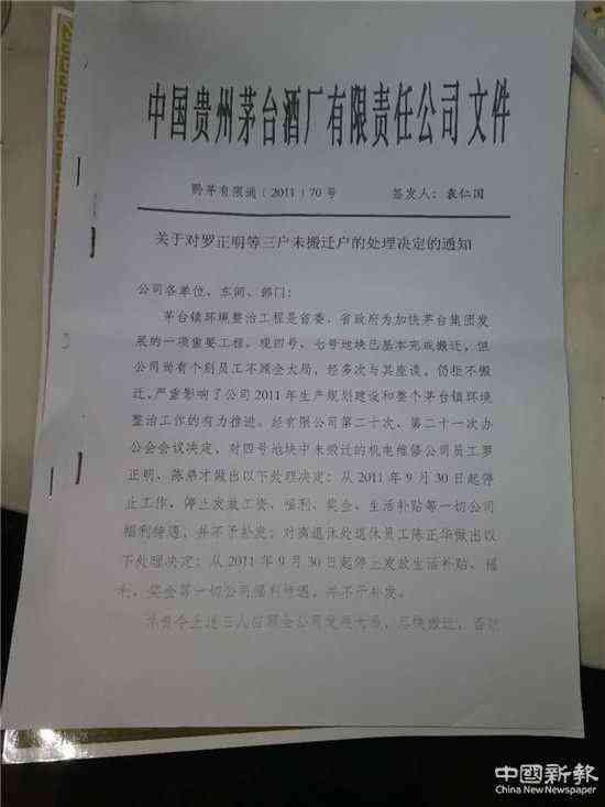 從陳弟才出示的中國貴州茅臺酒廠有限責(zé)任公司黔茅有限通(2011)70號文件中,記者看到該文件內(nèi)容中確實有經(jīng)有限公司第二十次、第二十一次辦公會議決定,對四號地塊中未搬遷的機(jī)電維修公司員工羅正明、陳弟才的處理決定:“從2011年9月30日停止工作,停止發(fā)放工資、福利、獎金、生活補(bǔ)貼等一切公司福利待遇,并不予補(bǔ)發(fā)”的處罰。