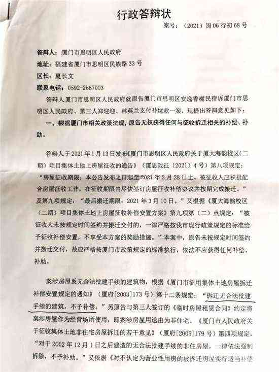 思明區(qū)區(qū)長夏長文在行政答辯狀稱:根據(jù)廈門市相關(guān)政策法規(guī),原告無權(quán)獲得任何與征收拆遷相關(guān)的補(bǔ)償、補(bǔ)助。原告對房屋進(jìn)行裝修及費(fèi)用無充分的事實(shí)依據(jù),其主張拆遷裝修補(bǔ)償亦無法律依據(jù)。并稱:2002年12月1日之后建造的無合法批建手續(xù)的非住房屋,一律強(qiáng)制拆除,不予補(bǔ)助;2003年7月1日后取得工商營業(yè)執(zhí)照的不予補(bǔ)償;2003年在拆遷公告發(fā)布后進(jìn)行房屋裝修的不予補(bǔ)償。