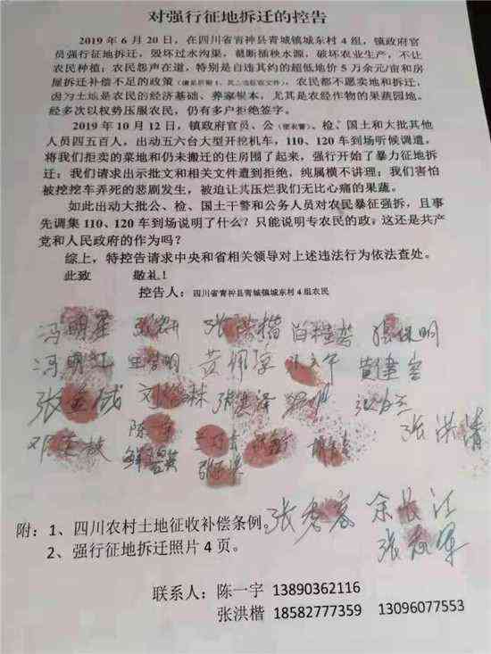 近日, 四川省青神縣的村民們向本報(bào)來信吐槽,稱人口不足20萬,可耕土地僅為9360公頃的小縣城,近年為了急于催生地方經(jīng)濟(jì)發(fā)展,樹立政績和形象工程,未經(jīng)村民同意,既不公示、公告,也不落實(shí)先安置補(bǔ)嘗后征拆的政策,就組織公安、醫(yī)療及社會大軍開著工程車對紅線內(nèi)數(shù)千畝現(xiàn)有農(nóng)田和房屋進(jìn)行狂征強(qiáng)拆。