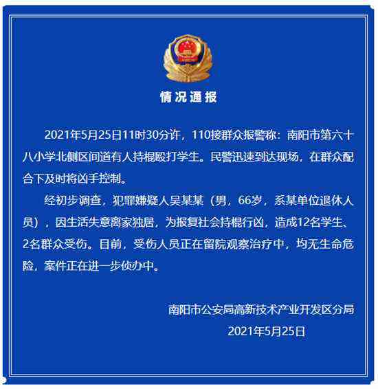 據(jù)河南省南陽市公安局官方微博5月25日通報,25日11時許,110接群眾報警稱:南陽市第六十八小學(xué)附近有人持棍毆打?qū)W生,兇手已被群眾及時控制。經(jīng)初步調(diào)查:犯罪嫌疑人吳某某(男,66歲,系某單位退休人員),因生活失意離家獨居,為報復(fù)社會持棍行兇,造成12名學(xué)生、2名群眾受傷。目前,傷者正在留院觀察治療中,均無生命危險。