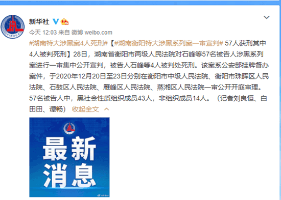 據(jù)@新華社 微博消息,5月28日,湖南省衡陽(yáng)市兩級(jí)人民法院對(duì)石峰等57名被告人涉黑系列案進(jìn)行一審集中公開(kāi)宣判,被告人石峰等4人被判處死刑。該案系公安部掛牌督辦案件,于2020年12月20日至23日分別在衡陽(yáng)市中級(jí)人民法院、衡陽(yáng)市珠暉區(qū)人民法院、石鼓區(qū)人民法院、雁峰區(qū)人民法院、蒸湘區(qū)人民法院一審公開(kāi)開(kāi)庭審理。57名被告人中,黑社會(huì)性質(zhì)組織成員43人,非組織成員14人。
