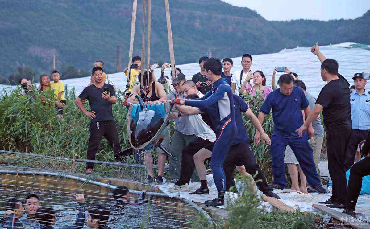 7月7日晚,救援人員對(duì)瓜頭鯨執(zhí)行放歸大海行動(dòng)。(潘侃俊 攝)