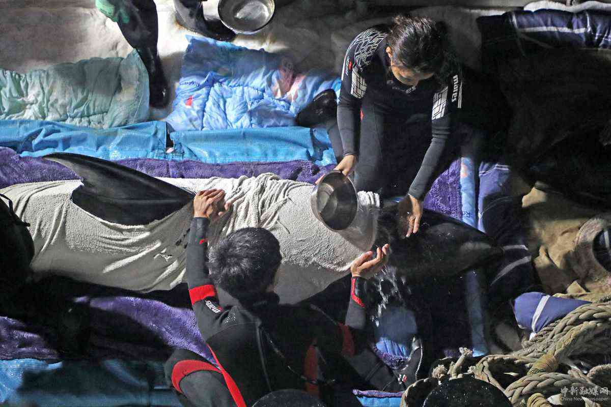 7月7日晚,救援人員為即將放歸大海的瓜頭鯨蓋上濕毛巾并澆水,防止水分蒸發(fā)。(潘侃俊 攝)