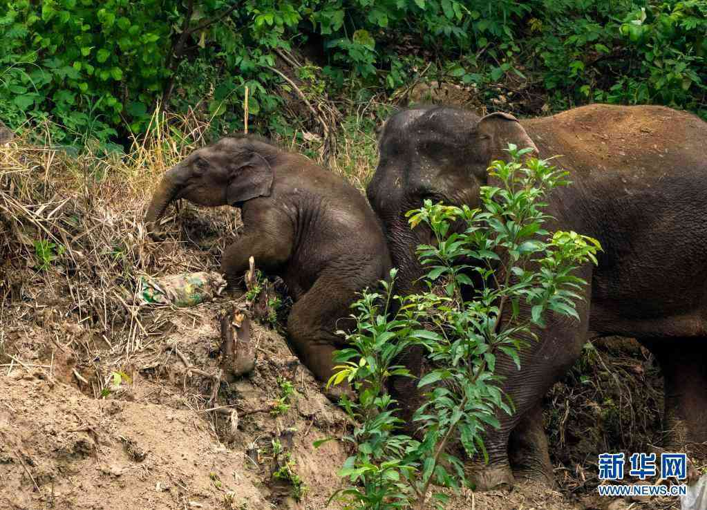 8月9日,在云南省玉溪市元江縣,小象在成年大象的幫助下爬坡。新華社記者 江文耀 攝