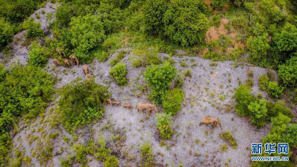 這是5月28日在云南省玉溪市峨山縣境內(nèi)拍攝的象群(無人機(jī)照片)。新華社記者 胡超 攝