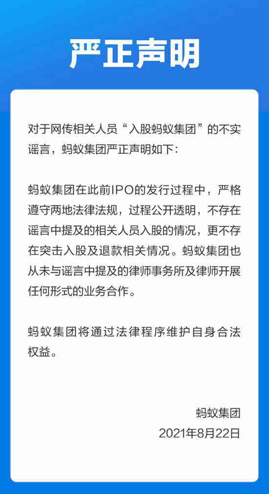 螞蟻集團(tuán)發(fā)布聲明:網(wǎng)傳“相關(guān)人員入股”為謠言