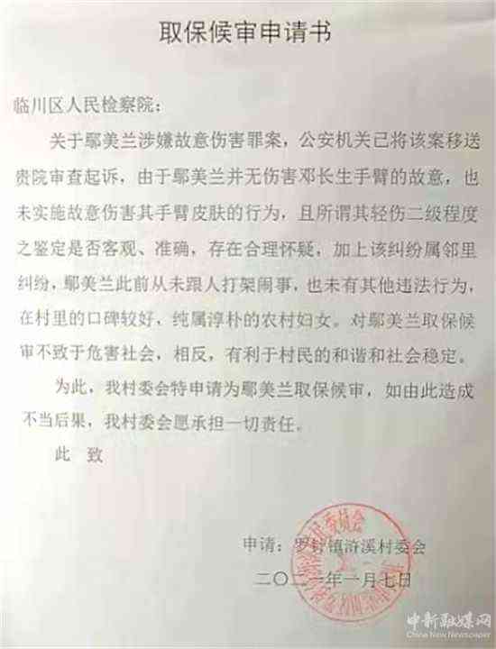 案件進(jìn)入檢察院審查起訴后,滸溪村委會向檢察院申請取保候?qū)?。申請書?qiáng)調(diào):鄢美蘭是一名純樸的農(nóng)村婦女,在村里口碑很好,從沒有違法行為,對其取保侯審,不會導(dǎo)致鄢美蘭危害社會,反而有利于村民和諧、社會穩(wěn)定,他們愿為鄢美蘭取保侯審承擔(dān)一切法律責(zé)任。