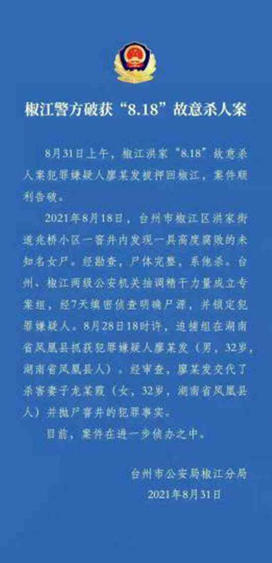 31日,浙江省臺州市公安局椒江分局發(fā)布通報稱,椒江警方破獲“8.18”故意殺人案。