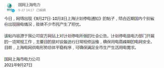 另外,27日,國(guó)網(wǎng)上海電力官方微博發(fā)布情況說(shuō)明稱:網(wǎng)絡(luò)出現(xiàn)《9月27日-10月3日上海計(jì)劃停電通知》的帖子,結(jié)合近期國(guó)內(nèi)個(gè)別省份出現(xiàn)限電情況,致使不少市民產(chǎn)生了擔(dān)憂。該帖內(nèi)容源于我公司官方網(wǎng)站上對(duì)計(jì)劃停電所做的社會(huì)公告。計(jì)劃停電是電力部門開展的一項(xiàng)常規(guī)工作,主要目的是對(duì)設(shè)備進(jìn)行日常檢修運(yùn)維,確保用電高峰期的電網(wǎng)安全。目前,上海電網(wǎng)供電形勢(shì)總體平穩(wěn)有序,可確保滿足全市生產(chǎn)生活用電需求。