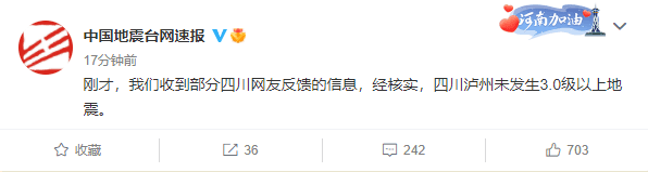 5日晚上9時許,有多名網(wǎng)友稱自己的手機(jī)收到警報:四川瀘州市納溪區(qū)發(fā)生8.1級地震。9時51分,中國地震臺網(wǎng)速報稱:“剛才,我們收到部分四川網(wǎng)友反饋的信息,經(jīng)核實,四川瀘州未發(fā)生3.0級以上地震。”