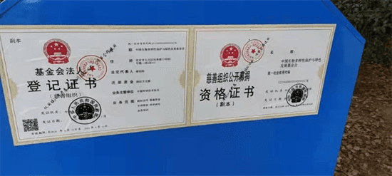 記者發(fā)現(xiàn),回收箱箱體上印有“中國生物多樣性保護(hù)與綠色發(fā)展基金會”,并附上監(jiān)督電話、服務(wù)電話及民政部備案號,箱體后面則貼上了“慈善組織公開募捐資格證書”和“基金會法人登記證書”。