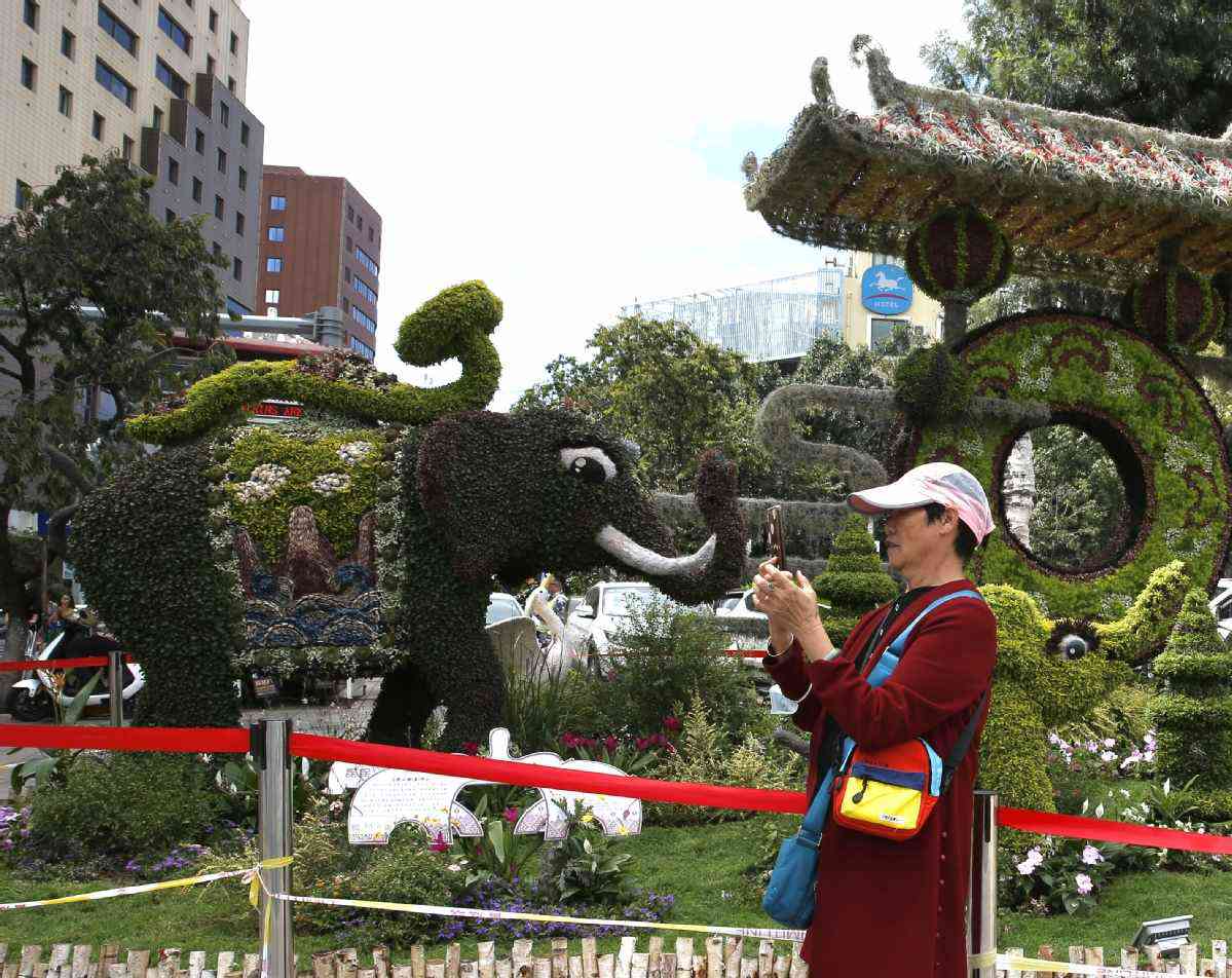 10月13日,昆明街頭,市民拍攝COP15主題花壇《我心相(象)印》。(中國日報記者 武曉慧 攝)