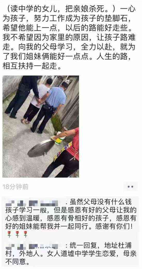 10月15日,有網(wǎng)友稱,浙江紹興杜浦村一名中學(xué)女生將其母親殺害。該網(wǎng)友發(fā)的照片顯示,一名女子雙手背在后面被處警人員押著走。15日下午,上虞區(qū)公安局道墟派出所工作人員告訴北青-北京頭條記者,15日上午,接到報(bào)警后派出所已出警,目前,嫌疑人已被控制,案件正在進(jìn)一步調(diào)查當(dāng)中。對(duì)于嫌疑人的身份和年齡,派出所并未透露。上虞區(qū)公安局工作人員也表示,案子目前還在調(diào)查中,具體情況以警方通報(bào)為準(zhǔn)。