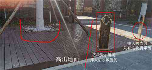 李女士稱(chēng),見(jiàn)自己重重摔倒,跟在自己身后的丈夫趕緊跑過(guò)來(lái)把自己扶起,此時(shí),自己摔倒的地方斜對(duì)面有個(gè)屋子,屋里兩個(gè)男工作人員剛好出來(lái)看到了這一幕,也趕忙攙扶自己。李女士說(shuō),見(jiàn)自己被絆倒,在原本有一塊提示牌邊上,一名工作人員又拿來(lái)一個(gè)提示牌放在了自己絆倒的地方。(紅色長(zhǎng)方形內(nèi)的提示牌是后放的)