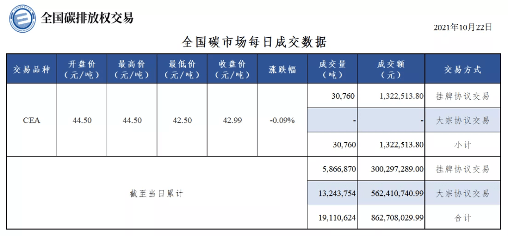記者從全國(guó)碳市場(chǎng)的交易運(yùn)營(yíng)和維護(hù)單位——上海環(huán)境能源交易所了解到,截至2021年10月22日,全國(guó)碳市場(chǎng)共運(yùn)行64個(gè)交易日,碳排放配額(CEA)累計(jì)成交量1911.06萬(wàn)噸,累計(jì)成交金額8.63億元。掛牌協(xié)議交易最高成交價(jià)61.07元/噸、最低成交價(jià)41.00元/噸。
