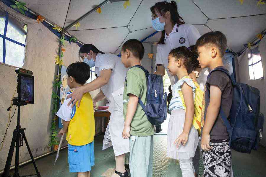 9月1日,北京朝莘幼兒園(慧忠園),孩子們在入園時排隊測量體溫。 (中國日報記者 匡林華 攝)