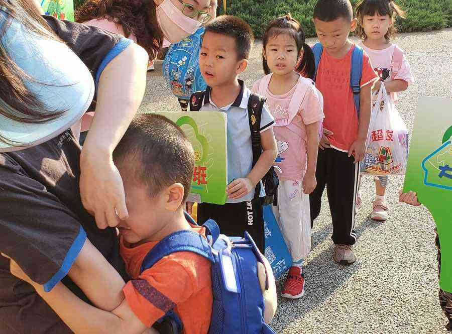 9月1日,北京紅星幼兒園(太平路園),小朋友與媽媽依依不舍。(中國日報記者 耿菲菲 攝)