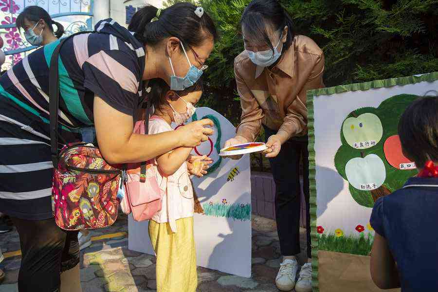 9月1日,北京朝莘幼兒園(慧忠園),老師在校門口迎接孩子入園。(中國日報記者 匡林華 攝)