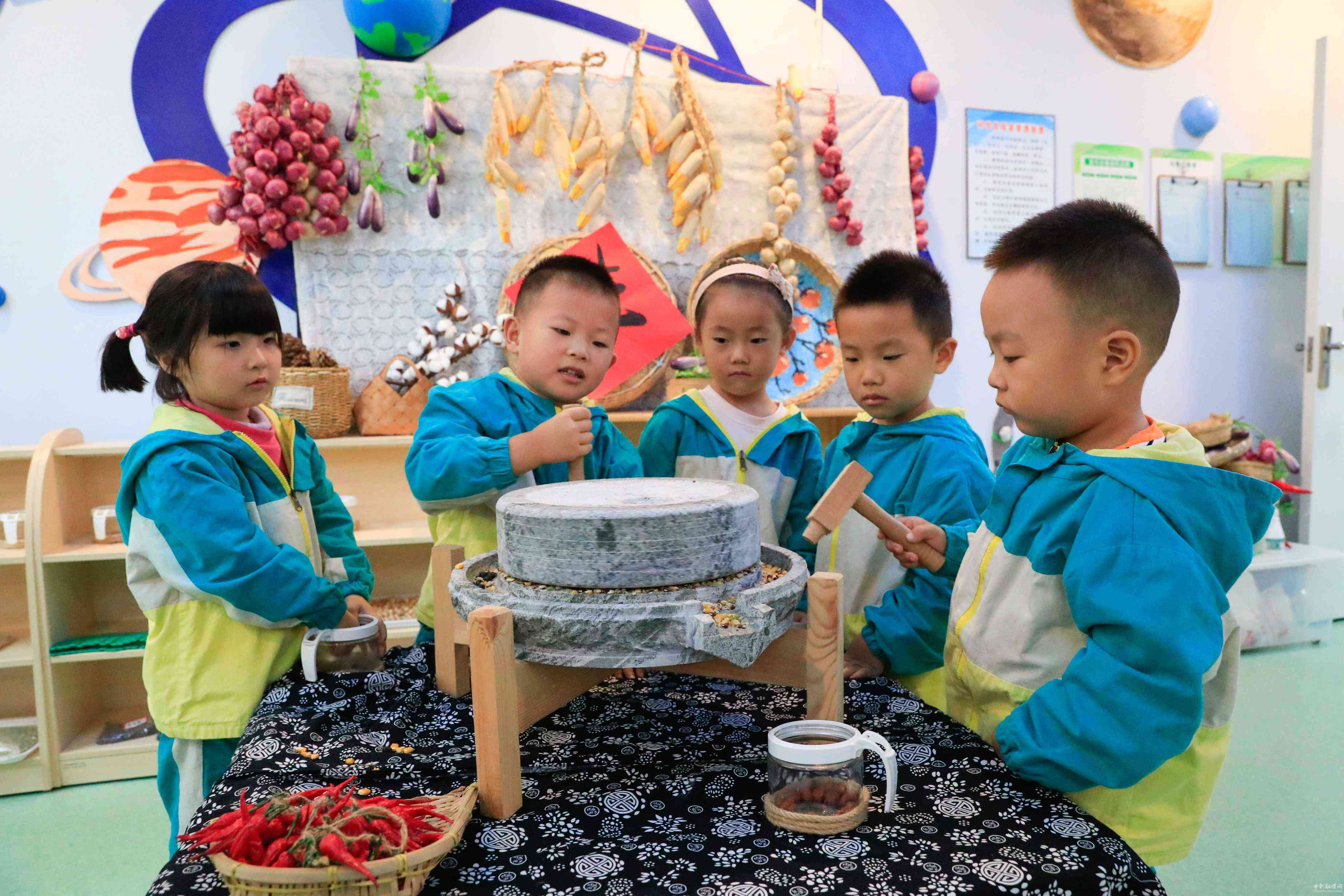 10月14日,安徽省合肥市廬陽(yáng)區(qū)一家幼兒園開(kāi)展“節(jié)約糧食 從小做起”主題教育活動(dòng),孩子們體驗(yàn)?zāi)ケP(pán)磨豆。(趙明 攝)