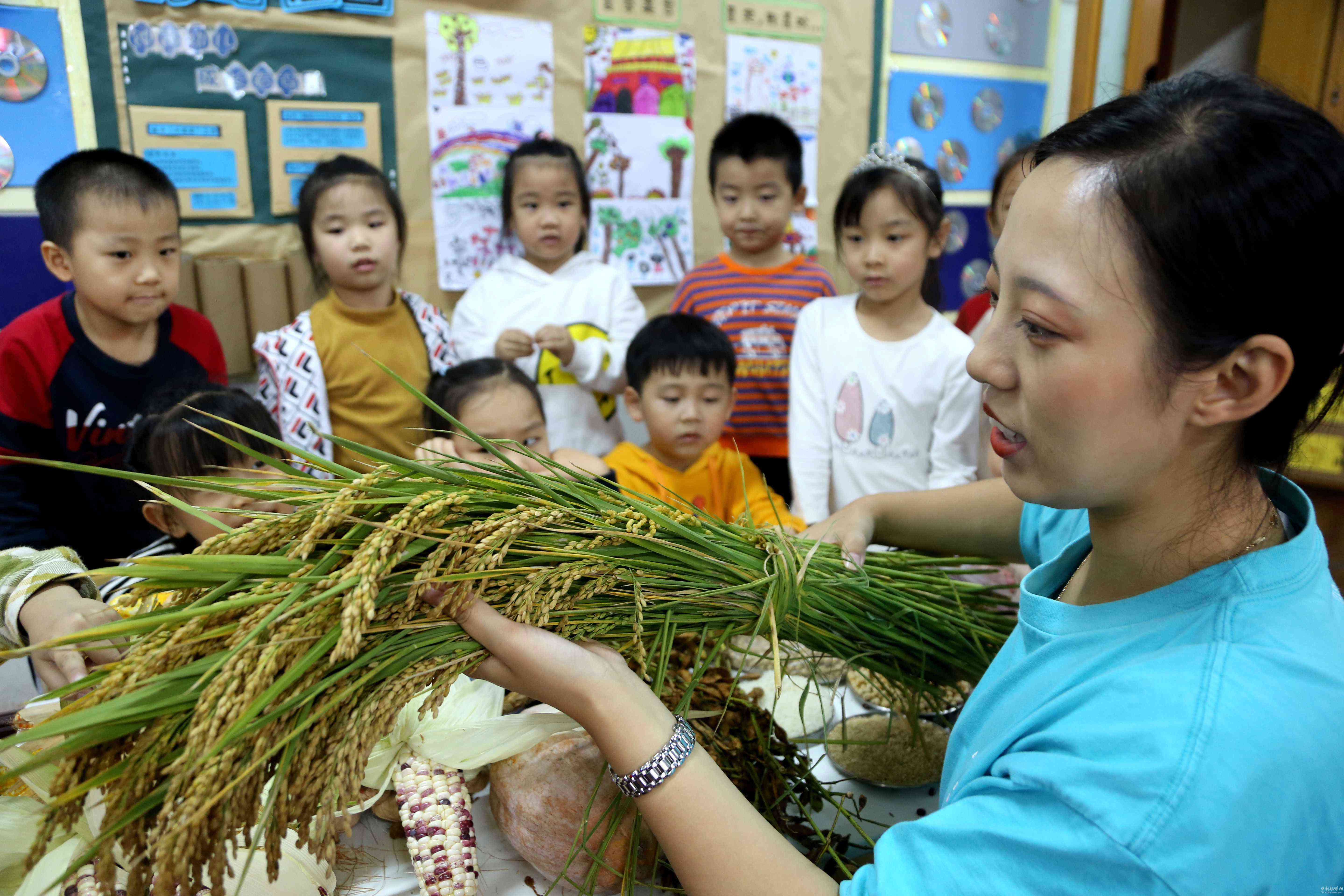 10月15日,江蘇省連云港市連云區(qū)一家幼兒園,老師給孩子們講解糧食知識(shí)。(王春 攝)