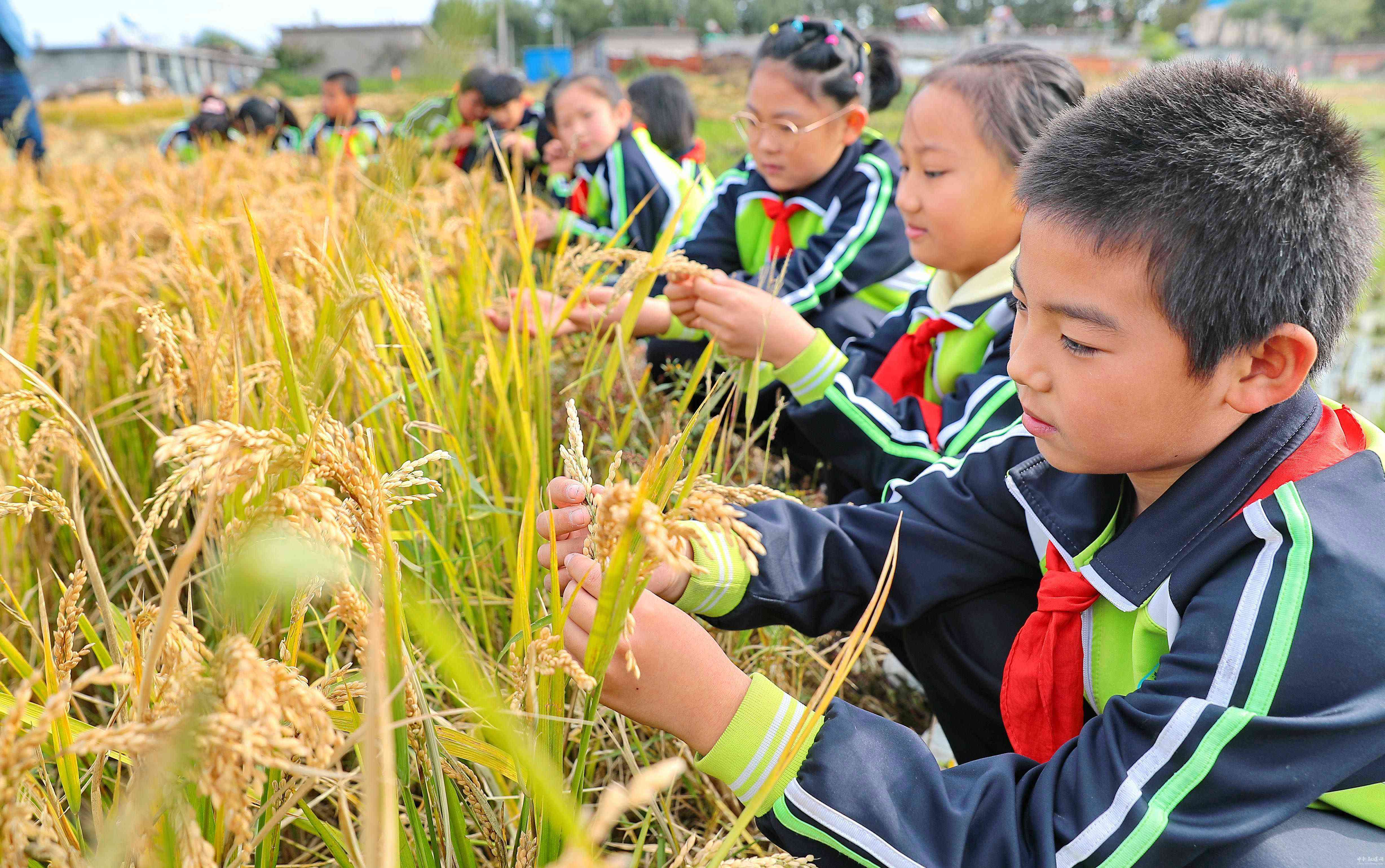 10月15日,河北省秦皇島市海港區(qū)東港鎮(zhèn)第二小學(xué)開(kāi)展“珍惜糧食從我做起”活動(dòng),學(xué)生們走進(jìn)水稻田觀察水稻。(曹建雄 攝)