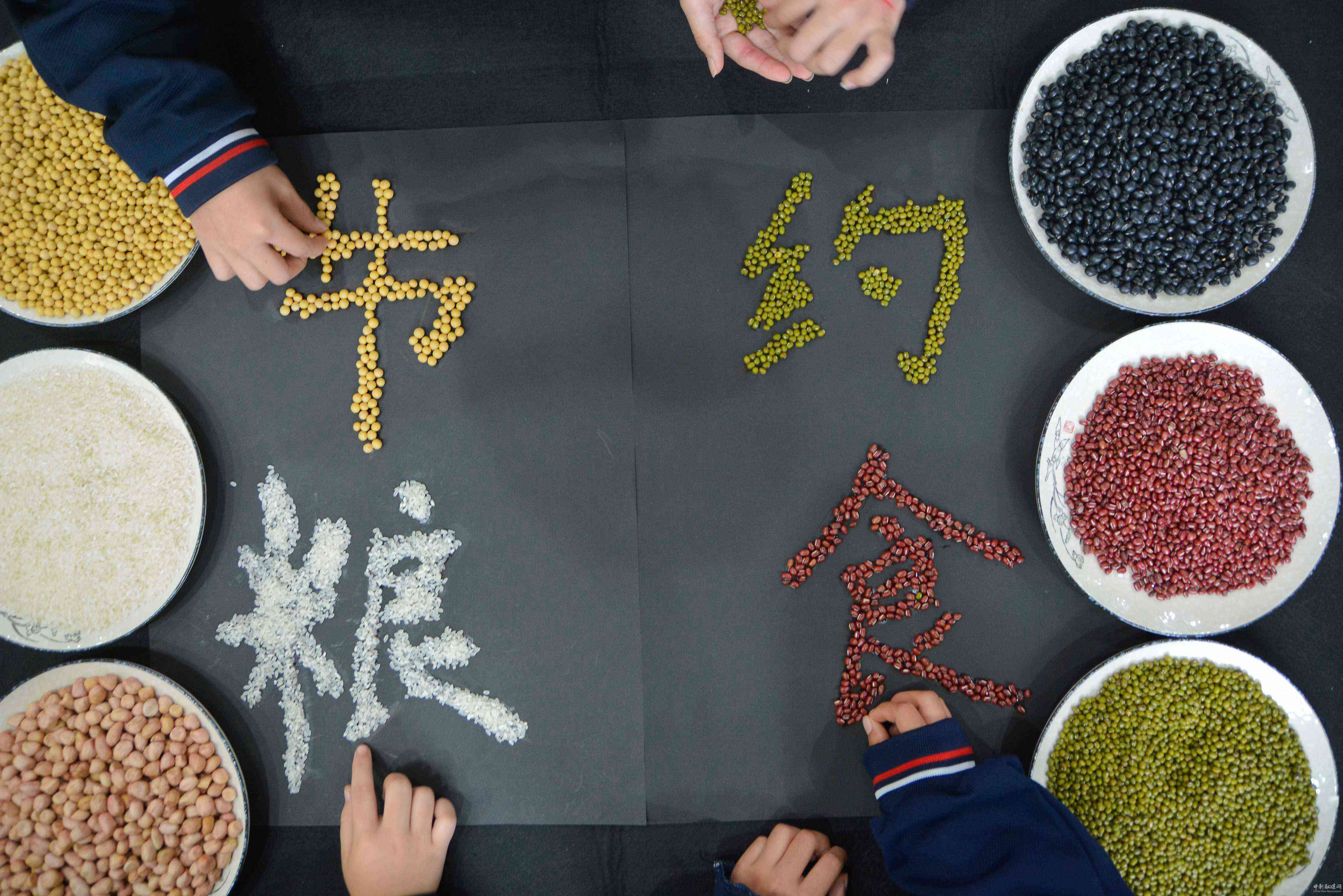 10月14日,河北省邯鄲市邯山區(qū)陽(yáng)光實(shí)驗(yàn)小學(xué),學(xué)生們用五谷雜糧拼成“節(jié)約糧食”字樣。(李昊 攝)