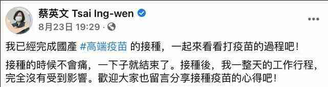 高端疫苗由臺(tái)灣高端公司研發(fā),23日開打。臺(tái)灣當(dāng)局領(lǐng)導(dǎo)人蔡英文接種該疫苗后,還在臉書發(fā)帖文稱:“接種的時(shí)候不會(huì)痛,一下子就結(jié)束了。接種后,我一整天的工作行程,完全沒有受到影響。歡迎大家也留言分享接種疫苗的心得吧!”