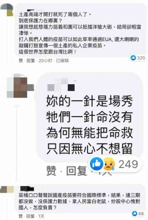臺(tái)灣民眾涌到蔡英文的社交媒體下留言,表達(dá)質(zhì)疑和憤怒。有網(wǎng)友質(zhì)問:“打入我們?nèi)梭w的疫苗怎能如此草率地通過EUA,還敲鑼打鼓宣傳。”