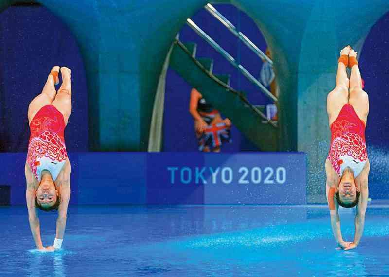 圖:王涵(左)及施廷懋入水前一刻。\新華社