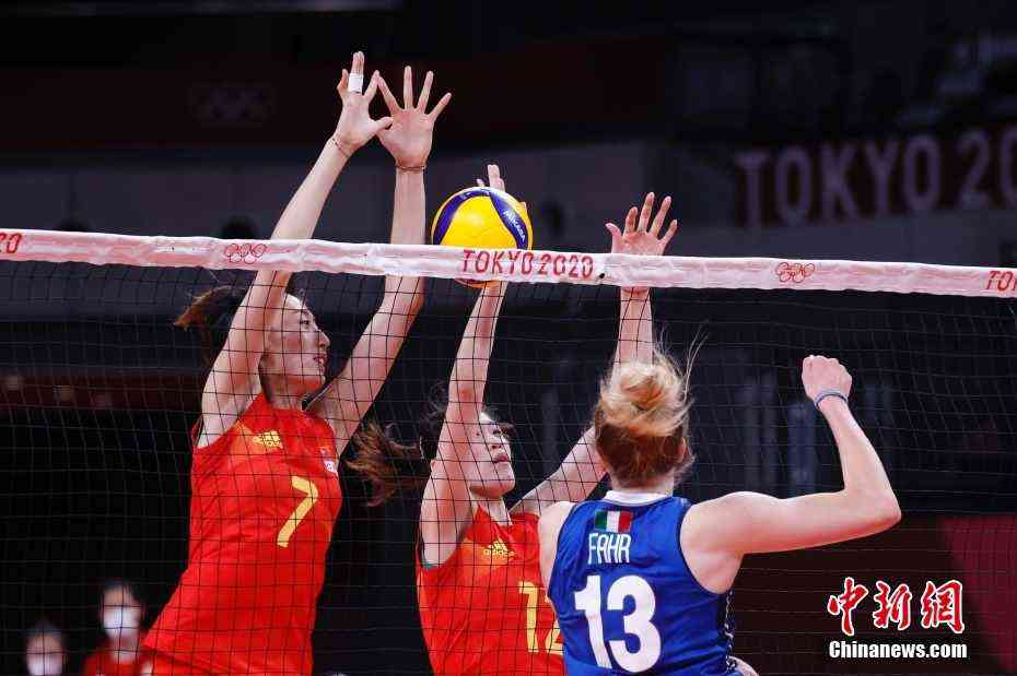 7月31日,中國隊(duì)球員進(jìn)行攔網(wǎng)。當(dāng)日,在東京奧運(yùn)會女子排球小組賽中,中國隊(duì)以3:0戰(zhàn)勝意大利隊(duì)。 中新社記者 韓海丹 攝