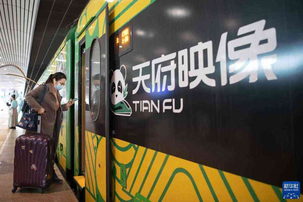 11月25日,乘客搭乘“天府映像”主題列車。當日,全國首列巴蜀文化主題涂裝復興號動車組“天府映像”在四川成都上線。該主題列車以CR200J型復興號動車組為車體,融入大熊貓、蓋碗茶、川劇折扇、蜀竹、太陽神鳥等文化元素,展示巴蜀地域的文化特色和人文底蘊。新華社記者 胥冰潔 攝