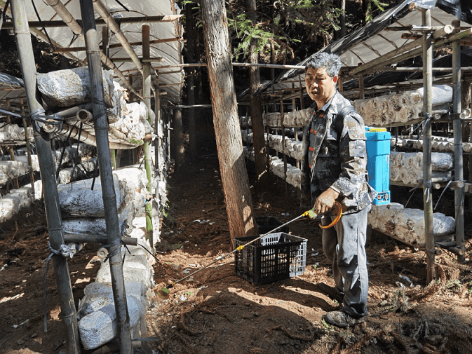 △易地扶貧搬遷戶楊應(yīng)祥忙著給菌棒澆水