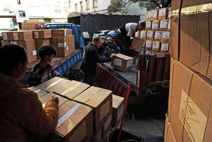 2019年11月28日,英國人奈杰爾(右二)在公司倉庫查驗(yàn)一批出口貨物。 2005年初,奈杰爾來到浙江省義烏市國際商貿(mào)城,為這里的經(jīng)營戶培訓(xùn)英語。2014年11月以來,中歐班列(義烏)相繼開通了11條線路。自此,奈杰爾的進(jìn)出口生意也有了新通道。新華社記者 譚進(jìn) 攝