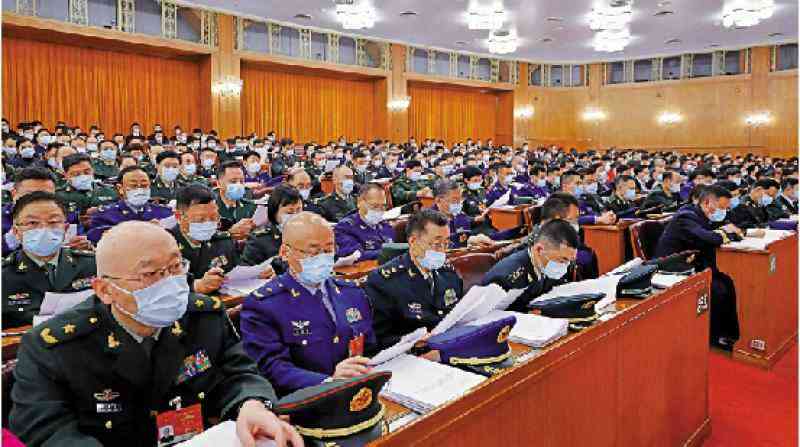 圖:3月5日,十三屆全國(guó)人大四次會(huì)議在北京人民大會(huì)堂開幕。圖為解放軍代表們?cè)谡J(rèn)真聽會(huì)。\中新社