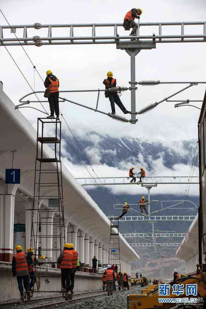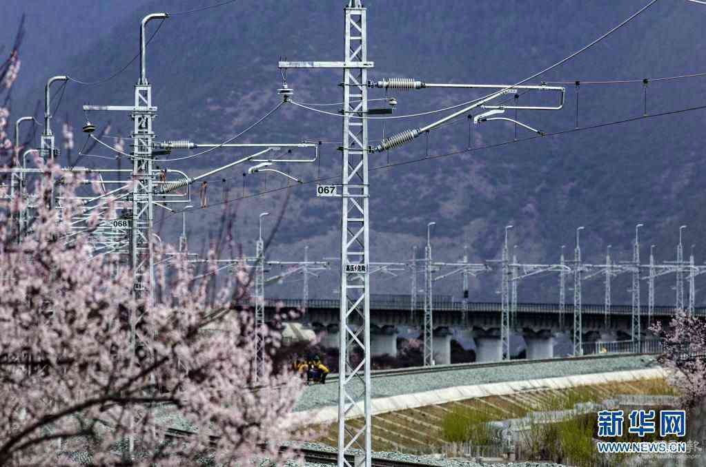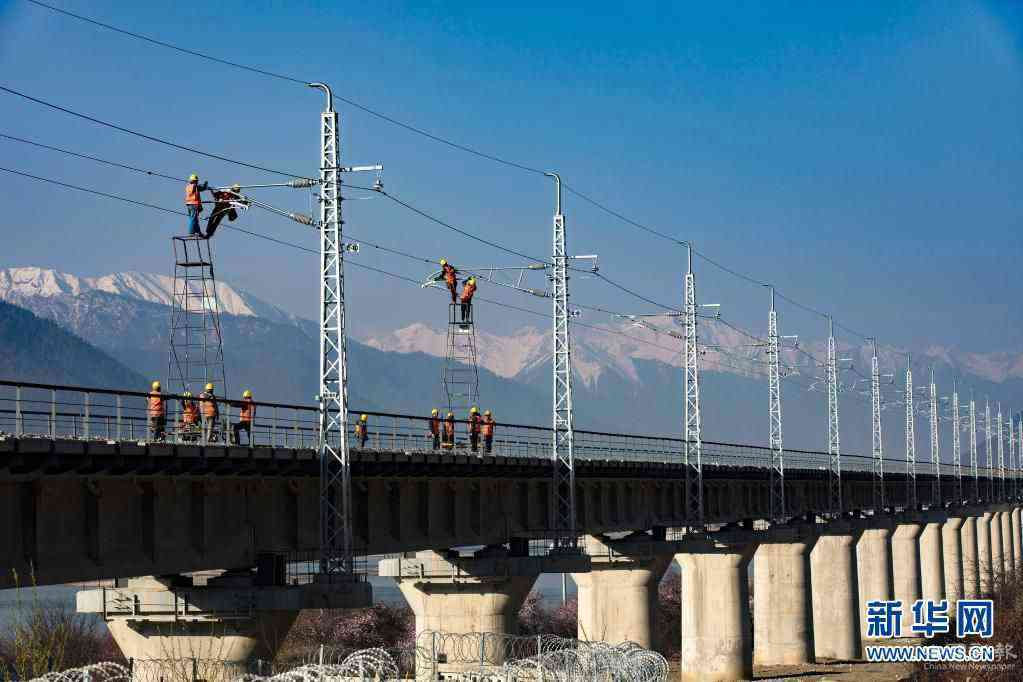 4月1日,中鐵電氣化局集團技術(shù)工人在林芝火車站進行接觸網(wǎng)精調(diào)作業(yè)。新華社發(fā)(焦宏濤 攝)