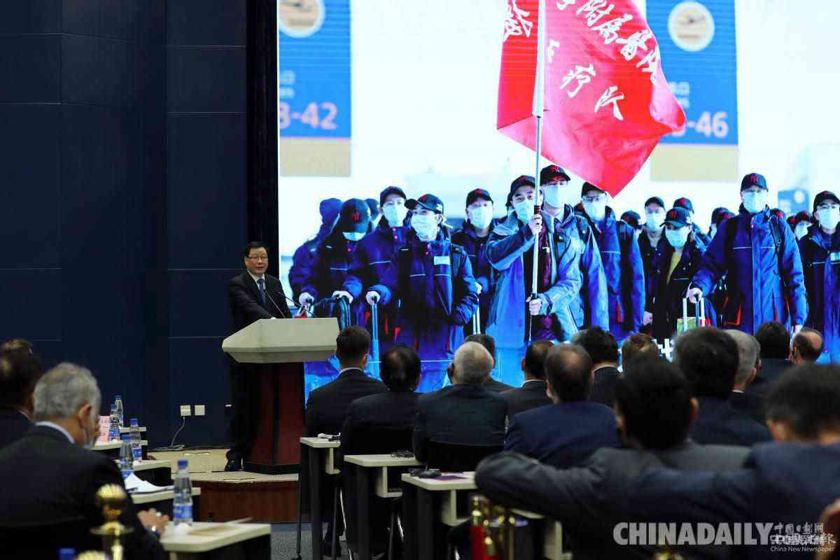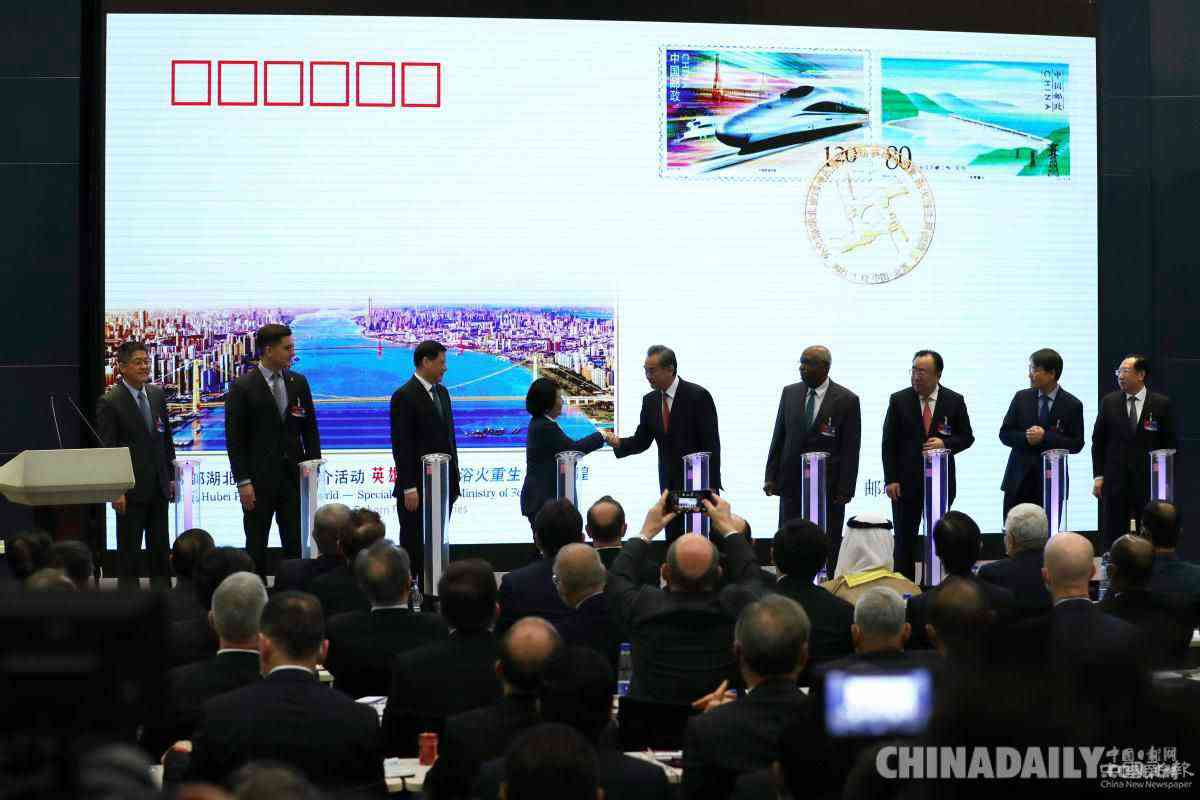 國(guó)務(wù)委員兼外長(zhǎng)王毅、湖北省主要領(lǐng)導(dǎo)及外國(guó)駐華使節(jié)代表等共同為湖北全球特別推介活動(dòng)特制外交紀(jì)念封揭幕。(中國(guó)日?qǐng)?bào)記者 王壯飛 攝)