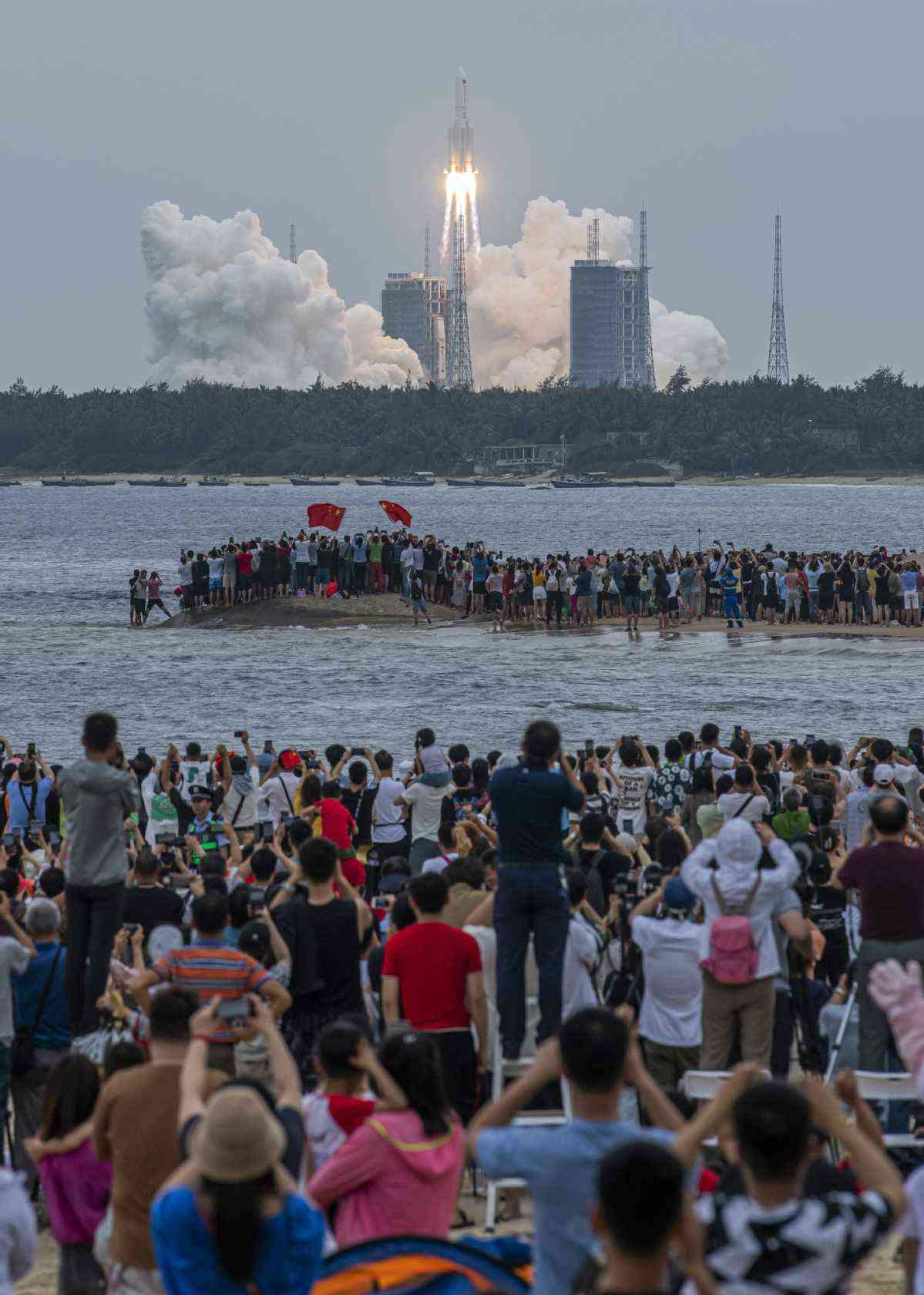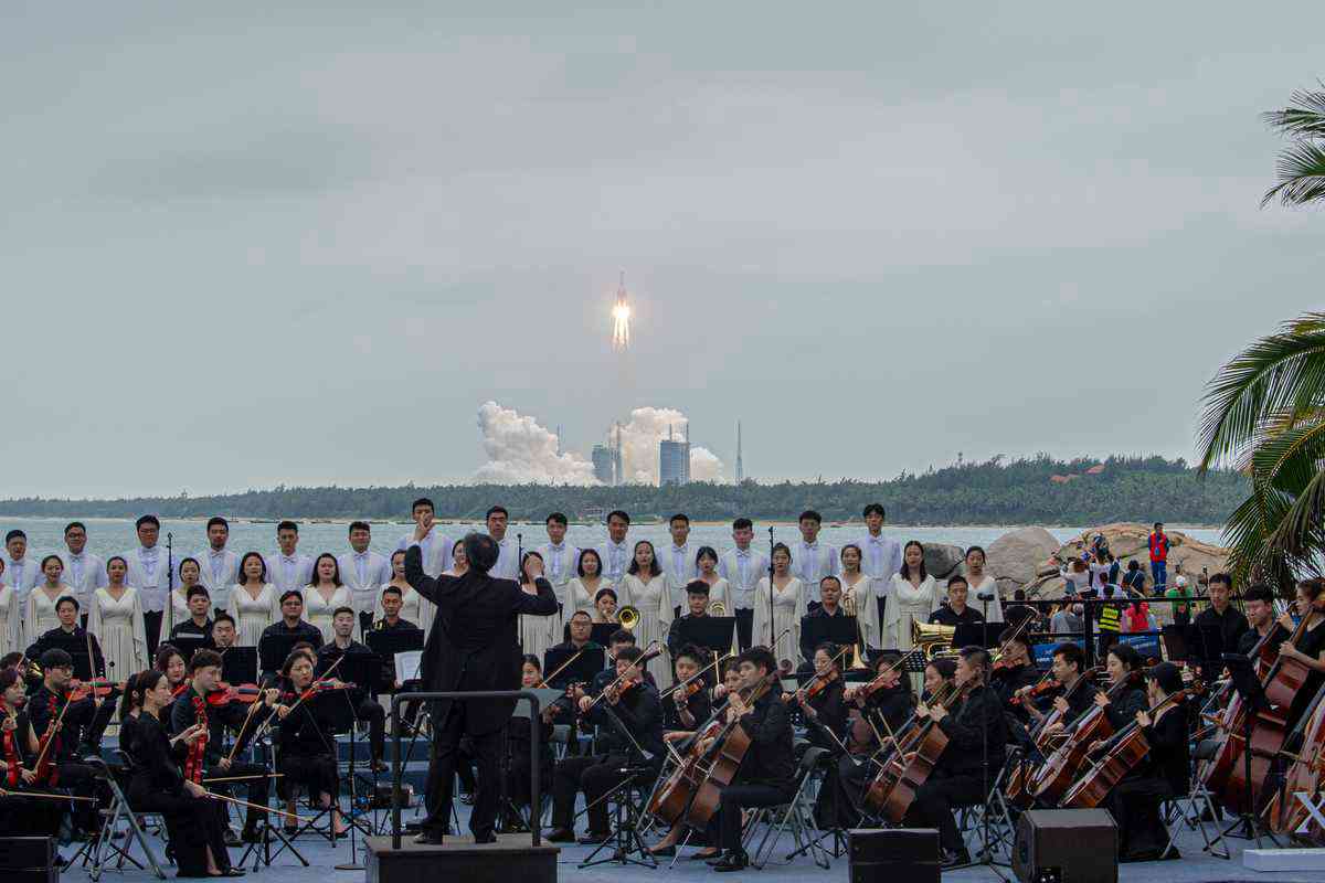 2021年4月29日,搭載著中國空間站天和核心艙的長征五號B遙二運載火箭,在我國文昌航天發(fā)射場點火升空,西安交響樂團在距離發(fā)射場不遠(yuǎn)的海灘上舉辦“大國重器·飛向太空交響音樂會”,同步奏響樂章。袁琛 攝