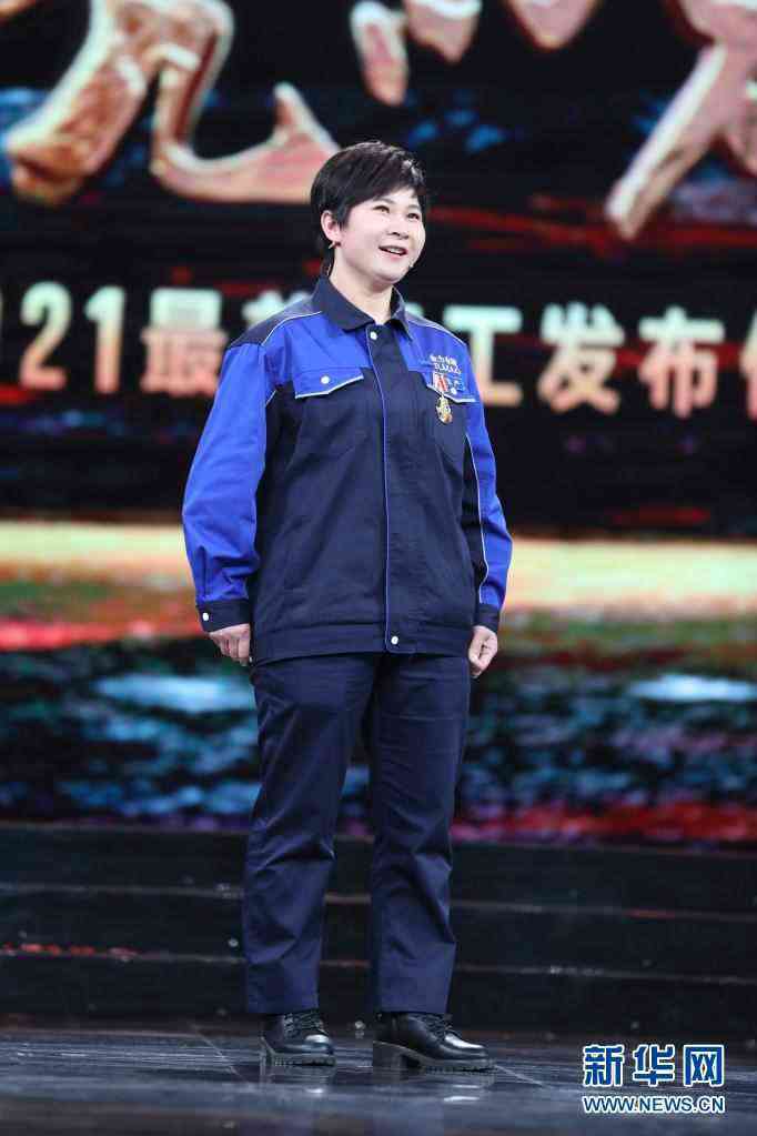 江西金力永磁科技股份有限公司生產(chǎn)車間的成型壓機(jī)操作能手溫小珍在北京舉行的2021年“最美職工”發(fā)布儀式現(xiàn)場(chǎng)(4月22日攝)。新華社發(fā)(吳凡 攝)
