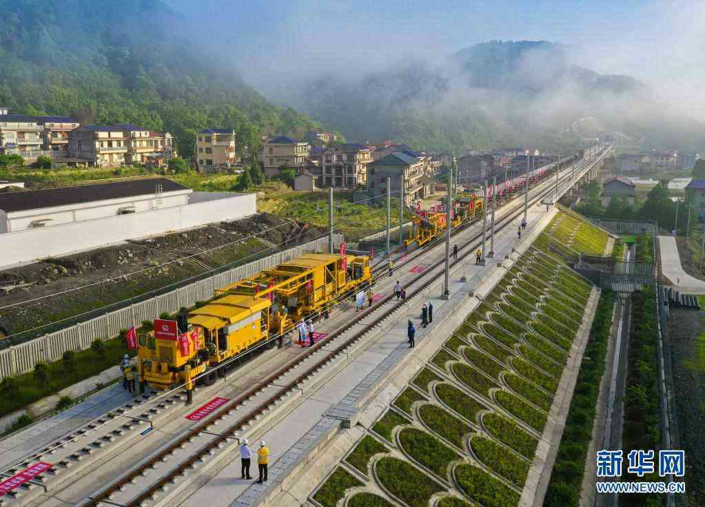 這是5月8日在張吉懷鐵路施工現(xiàn)場(chǎng)無(wú)人機(jī)拍攝的無(wú)砟軌道智能鋪軌機(jī)組(無(wú)人機(jī)照片)。新華社發(fā)