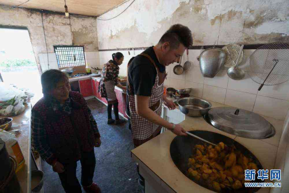 5月4日,邱超(右)和母親李蕓香(中)、奶奶在廚房準(zhǔn)備飯菜。 新華社記者 江宏景 攝