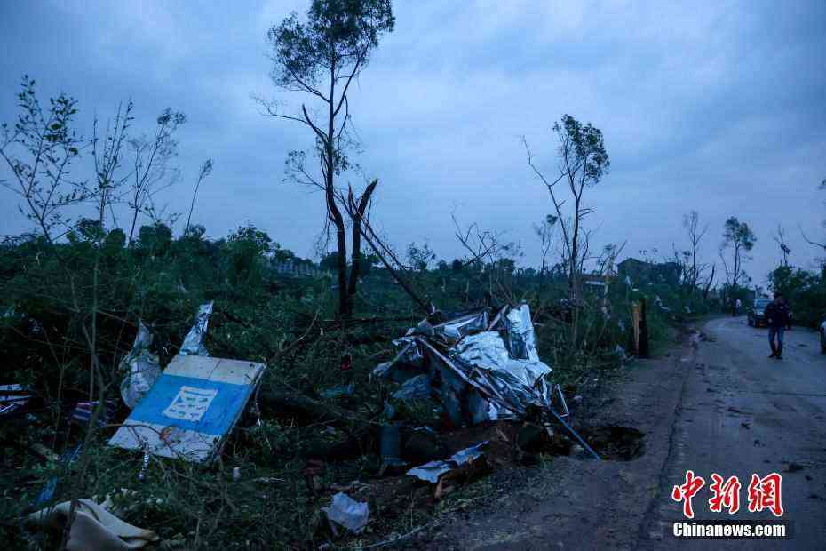 5月14日晚,武漢蔡甸區(qū)突發(fā)9級(jí)龍卷風(fēng),導(dǎo)致部分村灣房屋受損,大量樹(shù)木折斷,部分工棚倒塌。截至15日4時(shí)30分,因?yàn)?zāi)死亡6人,受傷218人;倒塌民房27戶85間,損壞民房130戶400間、塔吊2座、臨時(shí)工棚8000平方米。圖為吹落的鋼板呈“麻花”狀纏繞在道路兩側(cè)殘留的樹(shù)干上。 張暢 攝