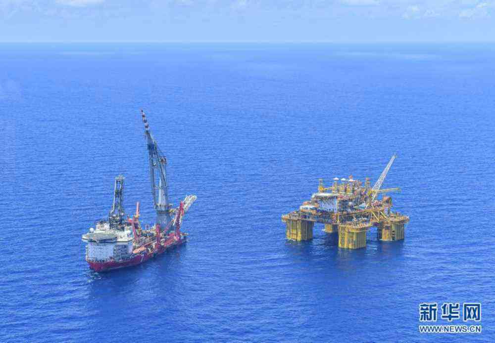 在海南島東南陵水海域拍攝的“深海一號”能源站和為其鋪設管線的作業(yè)船(5月12日攝)。