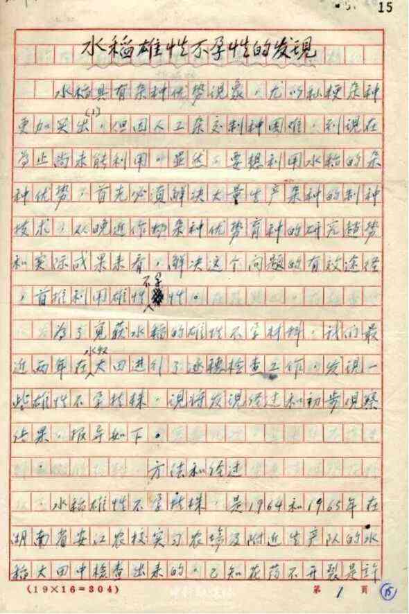 6年后,袁隆平發(fā)表第一篇論文《水稻的雄性不孕性》,刊登在中國(guó)科學(xué)院主編的《科學(xué)通報(bào)》半月刊第17卷第4期上。同年5月,國(guó)家科委九局局長(zhǎng)趙石英看到后,以科委九局名義致函湖南省科委與安江農(nóng)校,支持袁隆平的水稻雄性不育研究活動(dòng)。