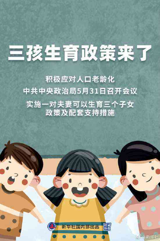 積極應(yīng)對人口老齡化,我國將出臺重大政策舉措。中共中央政治局5月31日召開會議,會議指出,進一步優(yōu)化生育政策,實施一對夫妻可以生育三個子女政策及配套支持措施,有利于改善我國人口結(jié)構(gòu)、落實積極應(yīng)對人口老齡化國家戰(zhàn)略、保持我國人力資源稟賦優(yōu)勢。