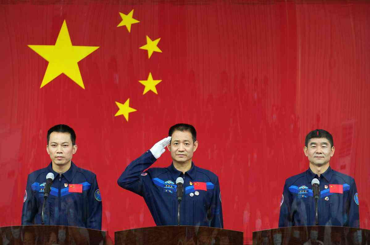6月16日,聶海勝、劉伯明、湯洪波3名航天員在酒泉衛(wèi)星發(fā)射中心問(wèn)天閣與中外媒體記者集體見(jiàn)面。 汪江波 攝