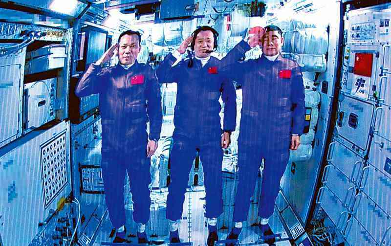 圖:6月17日在北京航天飛行控制中心拍攝的進(jìn)駐天和核心艙的航天員聶海勝、劉伯明、湯洪波向全國人民敬禮致意的畫面。\新華社