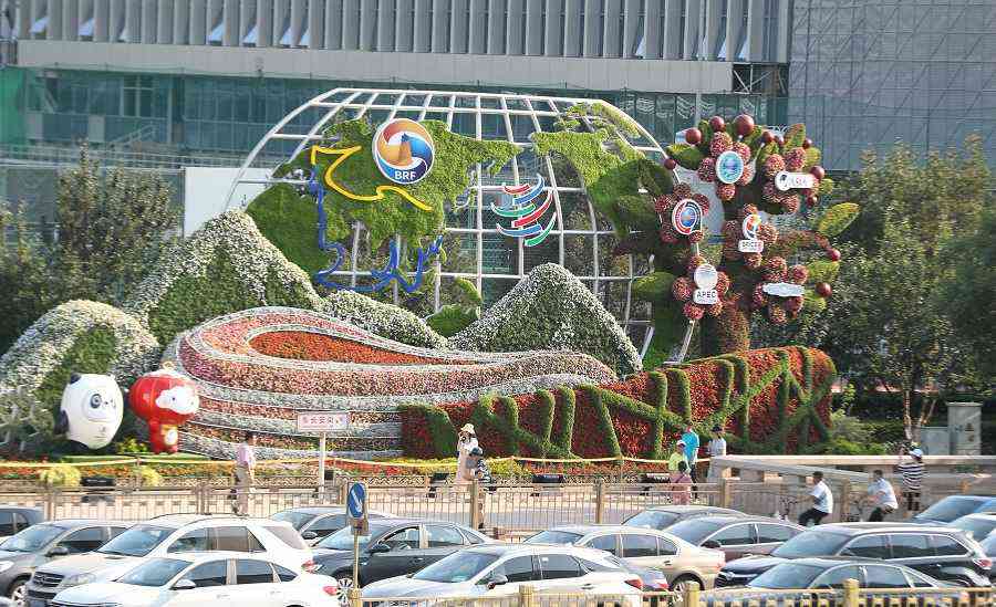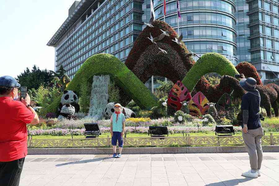 6月22日在東單西南角拍攝的以“走向世界”為主題的立體花壇。中國日報記者 鄒紅 攝